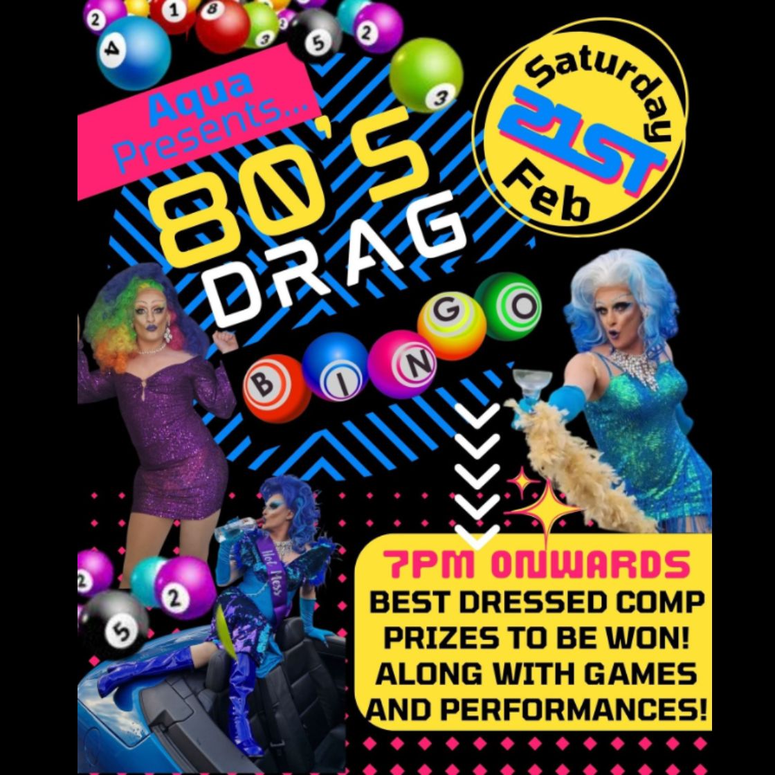 80s drag bingo – with games and performances. Best dressed comp.